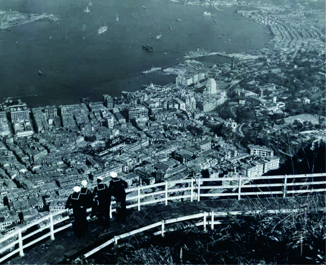 一九四零年代遊人在香港山頂盧吉道 (Lugard Road) 欣賞景色